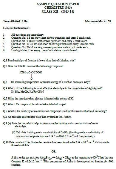 Hi guys today I would like to share a sample paper of chemistry. This would be very helpful for students who are studying in CBSE and are about to sit for there 12th Board exam. Everyone has a fear of boards of how to score good marks in boards. So, today I've tried to help you all a bit by sharing this paper. This paper was flashed in boards in the academic year 2013-14. Guys you can use this paper for practice purpose as well. Once you are confident with the subject just close your books and start solving papers. I'm sure it would be helpful to you. This paper includes all the chapters from solid states to organic all the chapters. Yes, you might be wondering about the solutions. In that case just comment me with your mail-id I shall inbox you with the solutions. This is done due to copyright issues. Without wasting much time here follows the papers:
